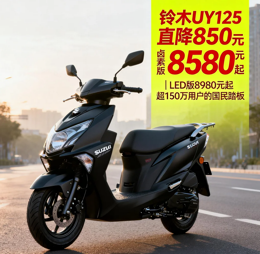 济南铃木官方公布,受欢迎的125cc踏板UY125全系列直接降了850元,车友圈子反应很热烈,跟以往变相优惠不一样,这次降价是真真切切的,两款主力车型都跌破9000元, 卤素大灯没箱子版本是8580元,LED大灯没箱子版本是8980元。