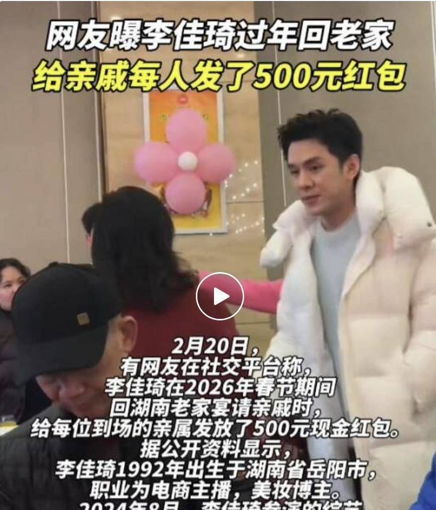 李佳琦的直播间五分钟就突破了亿元成交额。按这个节奏算,他大概一分钟能赚2000万!但2026年春节,他回到了湖南岳阳的老家,在一场摆了十几桌的家族宴席上,给到场的每位亲戚发了一个红包,每个红包里是500元现金。