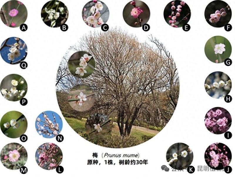 春节期间,正值昆明赏梅最佳时期。昆明植物园内梅花花开正艳,吸引众多市民游客游玩打卡。昆明植物园内的梅花有多少株?有哪些品种?近期,为了梳理昆明植物园内梅花品种资源现状,昆明植物园工作人员于梅花盛花期展开全园梅花清查,并邀请了国内知名梅花研究专家华珊正高级工程师现场指导,理清了园区内所有梅花植株的品种和分布。经鉴定,园区内分布有48株梅花植株。其中,41株梅花已确定分属17个品种,梅花原生种1株,树龄超过30年,待鉴定植株6株。