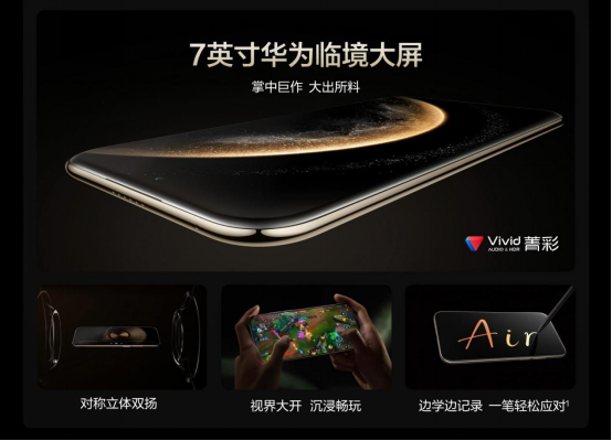 在大屏观影、游戏、办公已成日常的当下,华为Mate 70 Air的7英寸临境大屏显然更懂用户需求。其采用18.8:9黄金屏幕比例,不论横屏观影还是竖屏浏览,都能带来更具冲击力的视觉效果。同时,该屏幕通过了菁彩视听Audio & HDR Vivid认证,配合对称立体双扬声器,可营造出超过100°的宽广空间声场,看科幻大片时视觉全面沉浸化,玩FPS游戏时,子弹、人声的方位感清晰立体,沉浸感拉满。