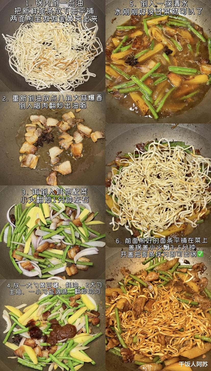 将之前煎好的面条均匀铺在菜上,盖上锅盖,小火焖煮3到5分钟。这一步是“焖”的核心,让蒸汽和汤汁慢慢渗透进面条,使其由外而内变得软糯入味。时间到后开盖,用筷子将面条与底下的菜和汤汁充分拌匀,让每一根面条都裹满酱汁,香气瞬间扑鼻而来。