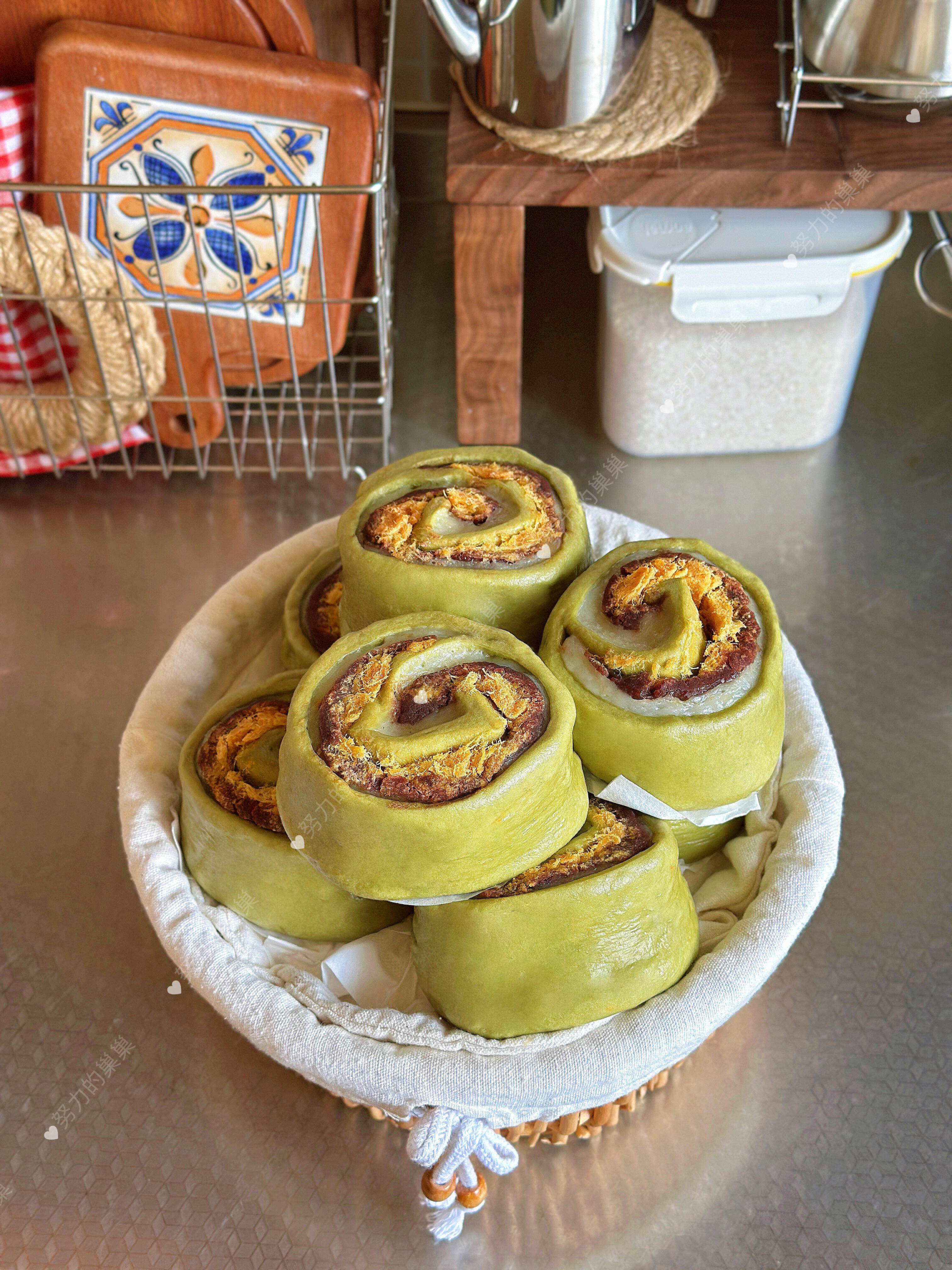 • 组装做法:醒发好的面团揉光滑,擀成长条面皮,铺上麻薯馅、豆沙馅,撒上肉松,从下往上卷起,切成小块,密封醒发至1.5倍大,上汽蒸15分钟即可。