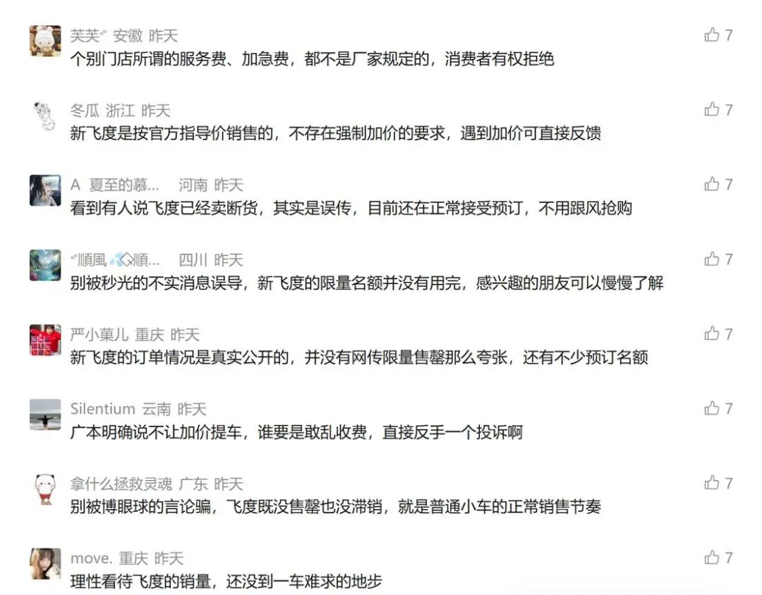 或许正因如此,很多报道新飞度的文章下面,才会有疑似白水军的用户在配合辟谣:“厂家不允许加价卖车”、“3000台限量没有售罄”。