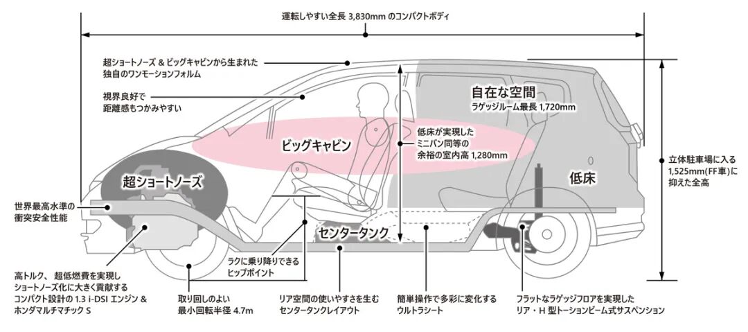 除了著名的MM理念——乘员空间最大化、机械空间最小化之外,还有位于后排的“魔术座椅”,既能坐人,又能拉货: