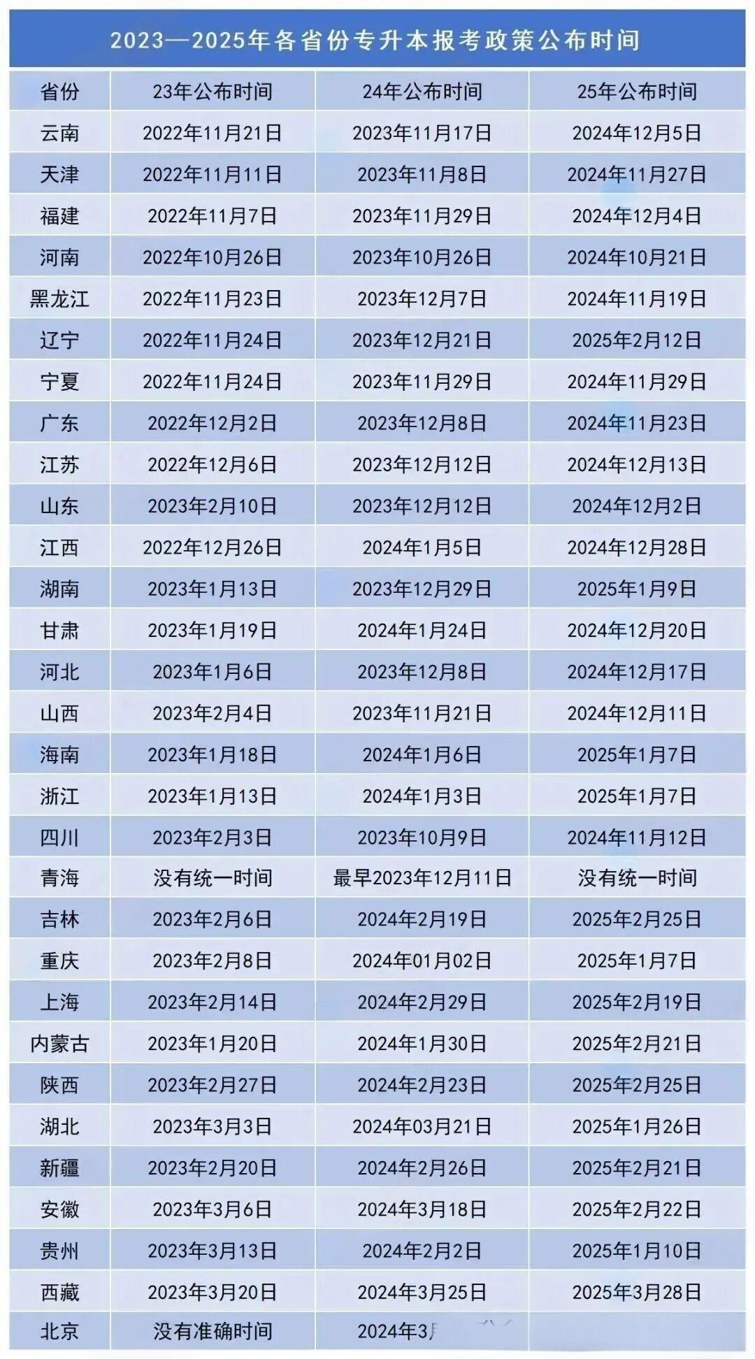 其余各省份专升本通知发布时间,同学们可以参考下方表格,这是根据近3年专升本官方招生考试政策发布时间来做的汇总。