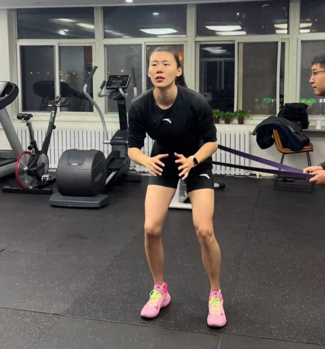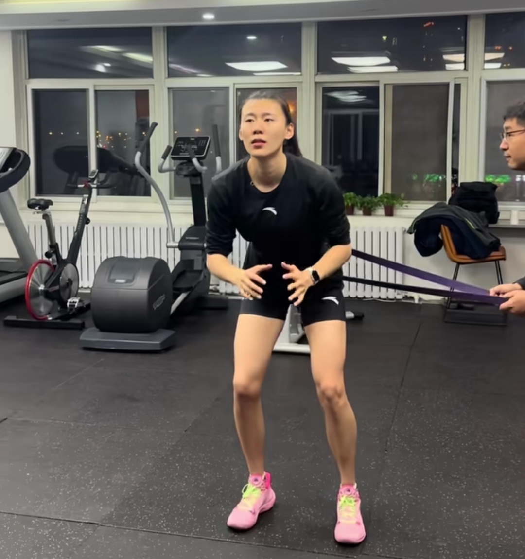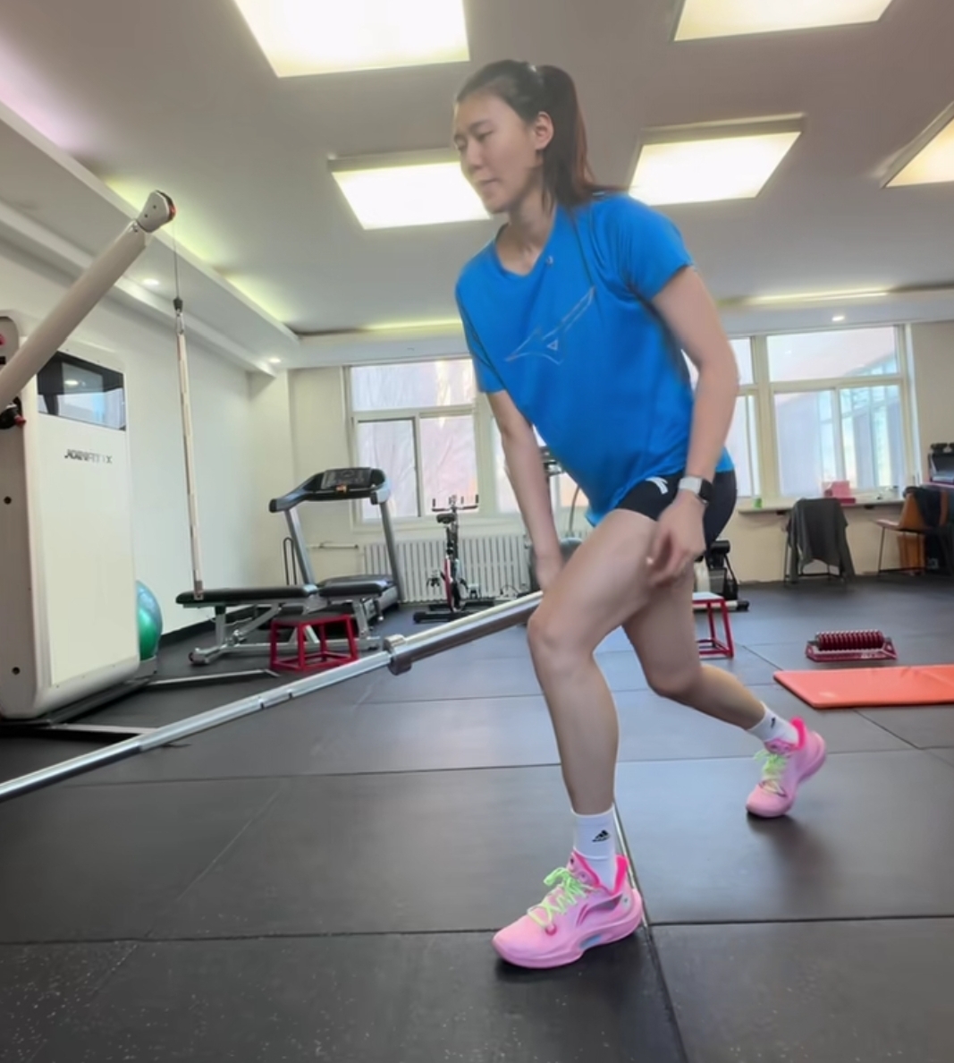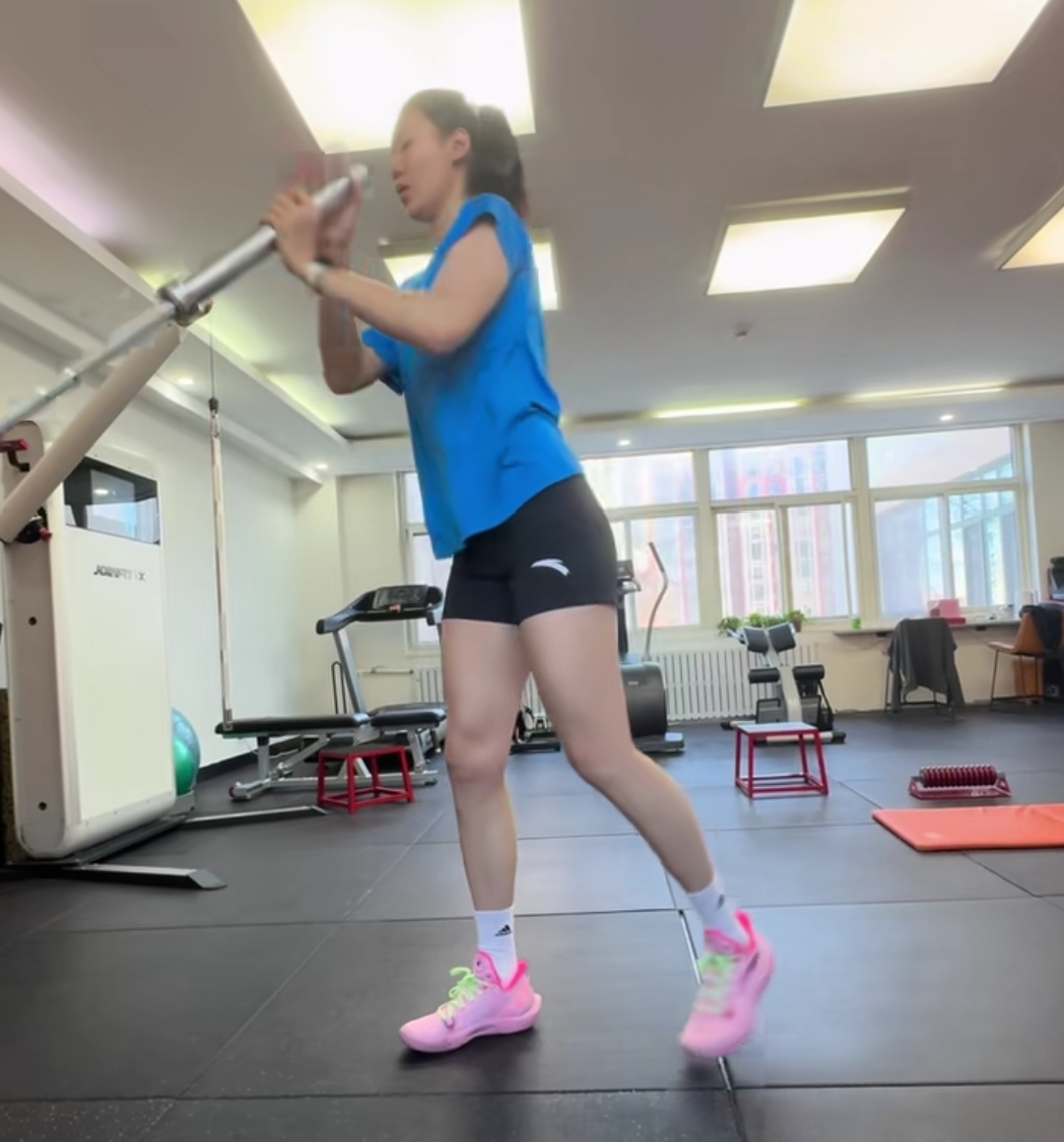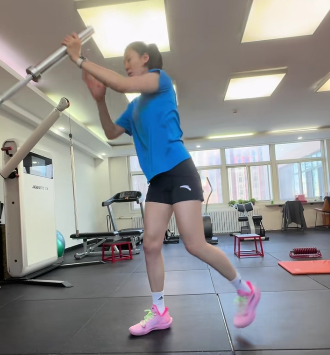 主攻手王艺竹然后抬起杠铃,完成一个循环的跳跃训练。画面中主攻手王艺竹穿着粉色的运动鞋,膝盖处已经没有护膝,左右双腿膝盖处已经恢复正常。