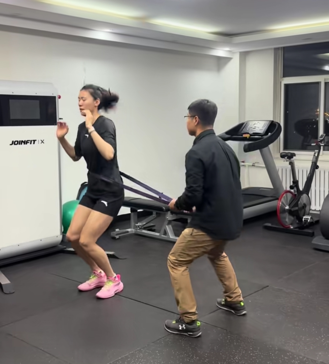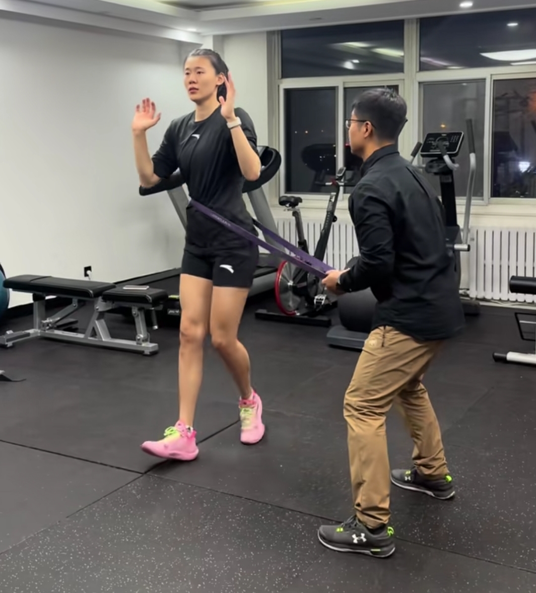 视频中主攻手王艺竹弯腰起身向旁边不断跳跃,助理教练使用弹性带子拉着王艺竹的腰部。