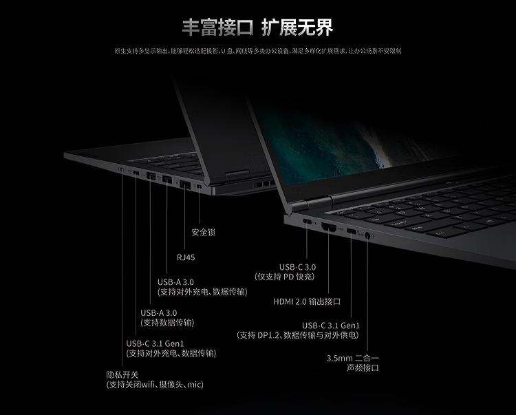 细节设计上,这款产品充分考虑了商务用户的使用习惯:背光键盘可以在光线较暗的环境下正常使用,一体式触控板支持多指手势操作,内置的大容量电池可以满足8小时以上的连续办公需求,不用随身携带充电器也能应对一整天的工作。接口方面,它配备了USB-A、USB-C、HDMI、RJ45网线接口等全尺寸接口,无需扩展坞即可直接连接投影、U盘、网线等外设,非常方便。