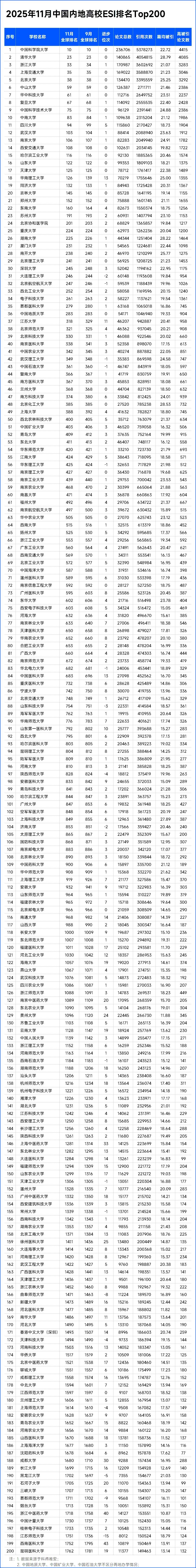 11月13日,科睿唯安(Clarivate Analytics)公布了2025年11月的ESI最新数据。ESI(基本科学指标数据库)是目前世界范围内普遍用以评价高校、学术机构、国家或地区国际学术水平及影响力的重要评价指标工具之一。本次数据覆盖时间范围为2015年1月到2025年8月。本文整理了中国内地高校200强的排名情况,一起来看看哪些高校又更进一步。