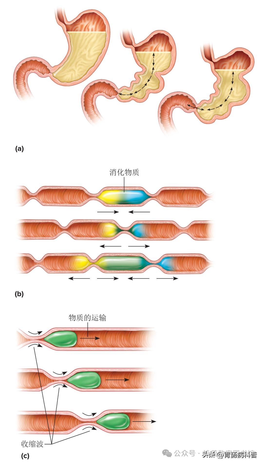 △ 消化道内的运动。(a) 混合运动发生在胃部肌肉壁的小段节律性收缩时。 (b) 分节运动用于混合小肠内的内容物。 (c) 蠕动波将内容物沿消化道向前推动。