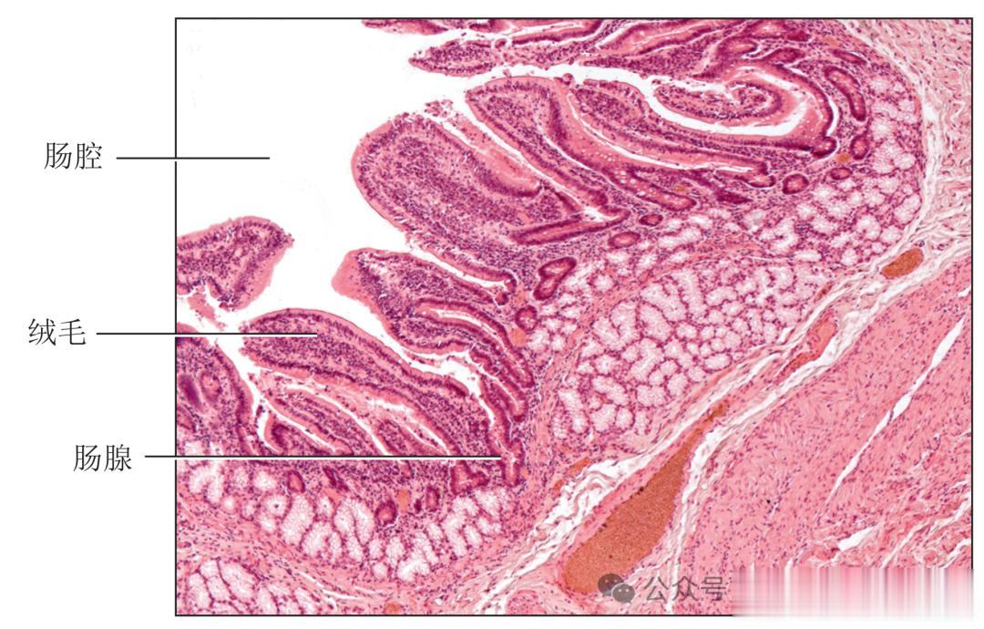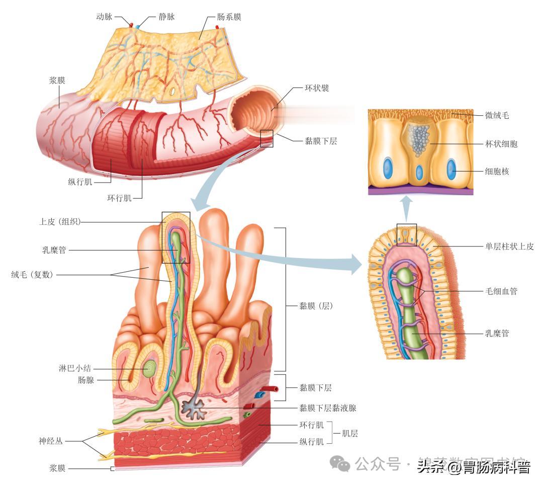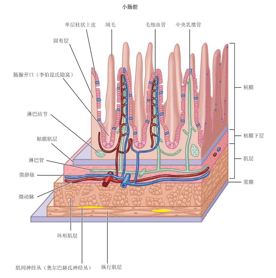 △ 小肠壁与其他消化道部分一样,由四层组成:内层黏膜、黏膜下层、肌层和外层浆膜。