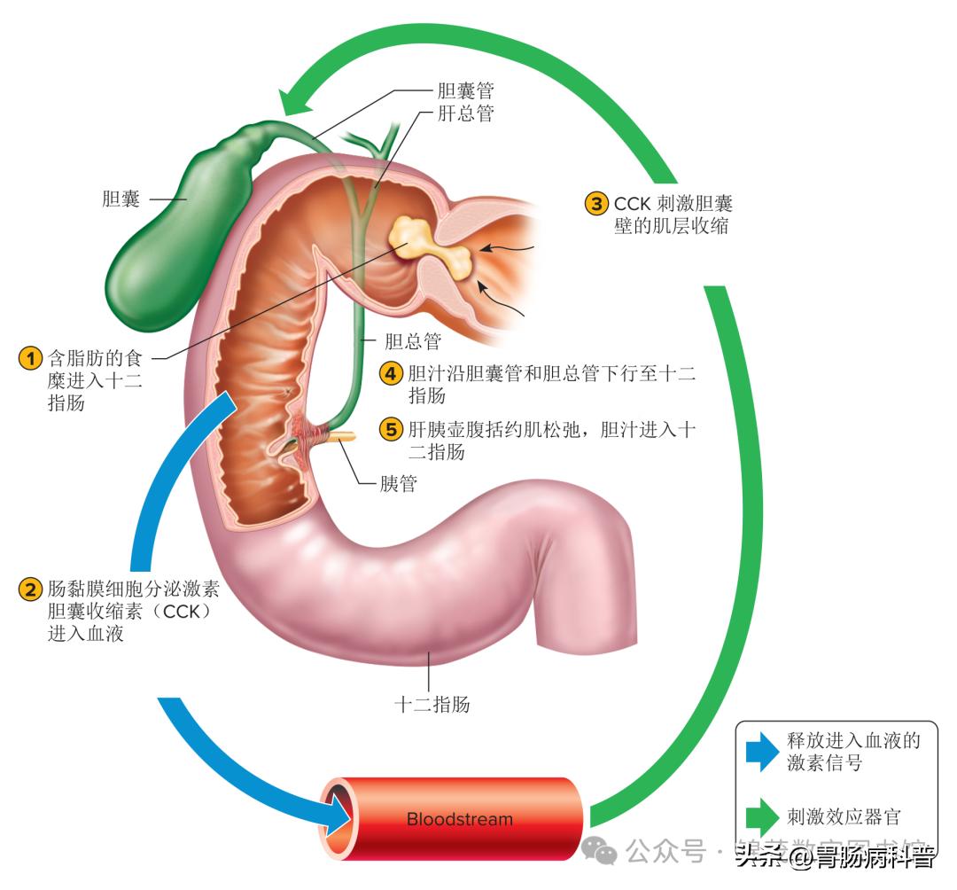 ▲ 脂肪性食糜进入十二指肠会刺激胆囊释放胆汁。