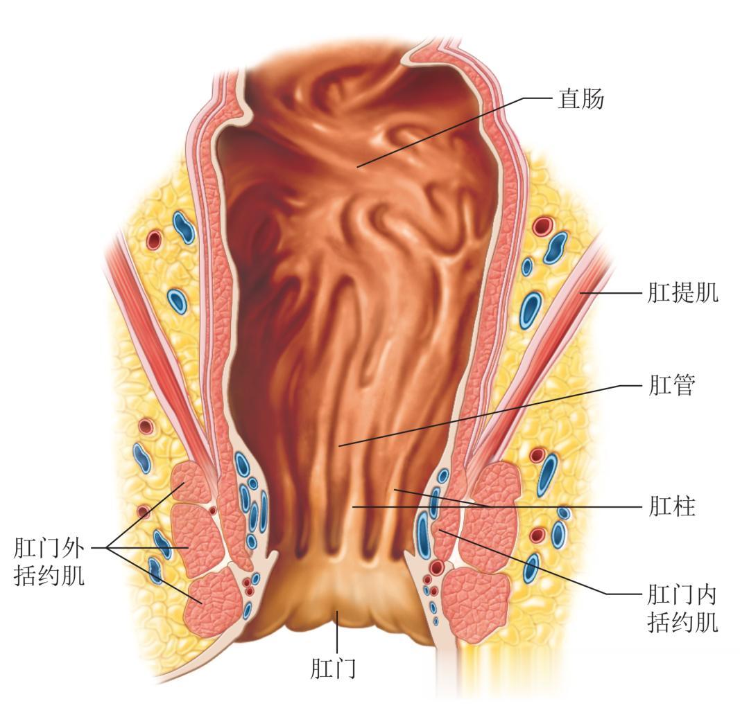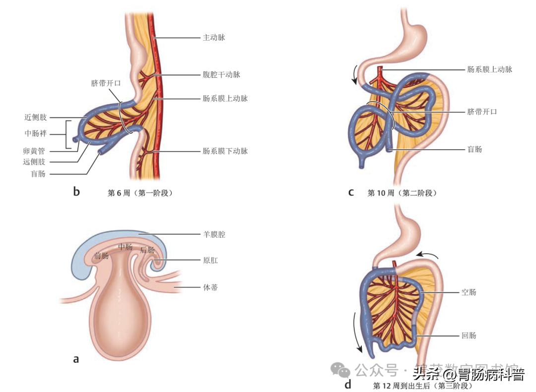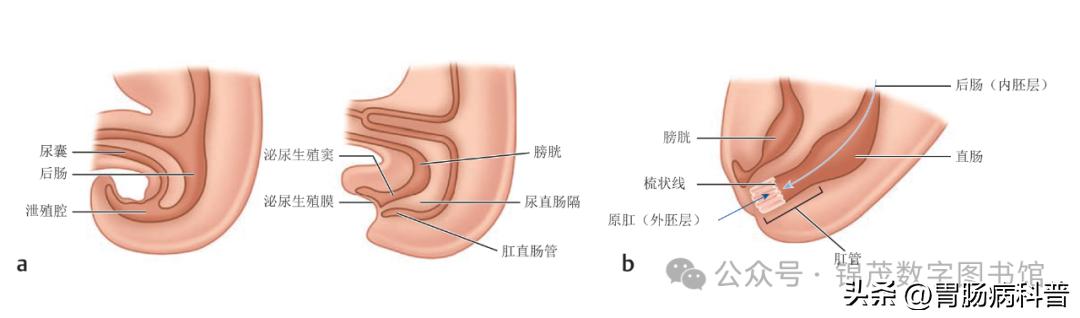 △ (a) 妊娠4周至7周期间肛直肠区的胚胎发育。(b) 肛直肠管的组成部分。