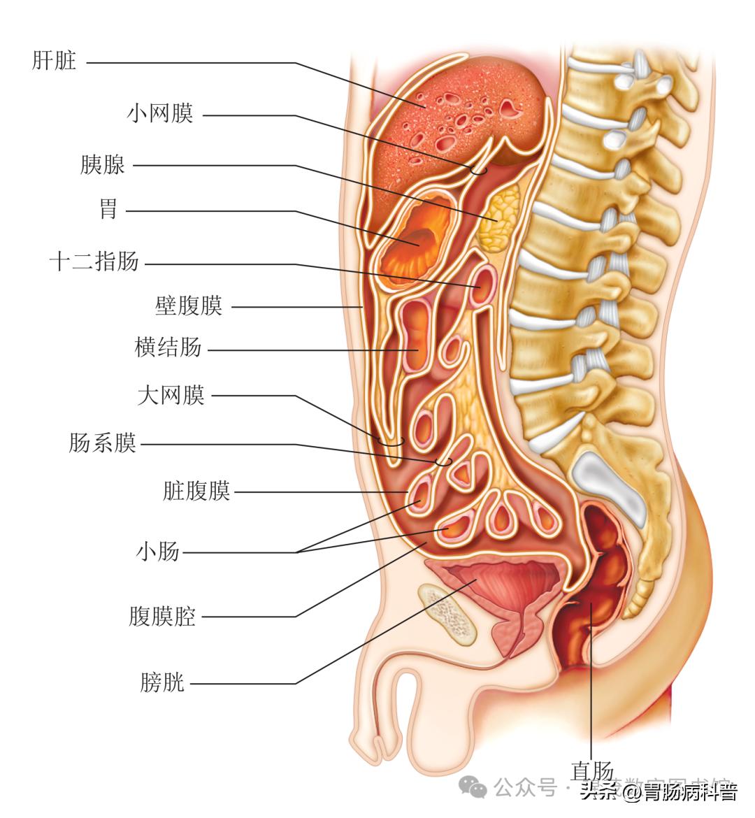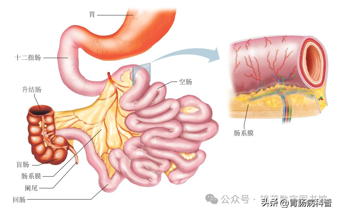 由腹膜褶皱形成的肠系膜将小肠的部分悬挂于腹后壁。