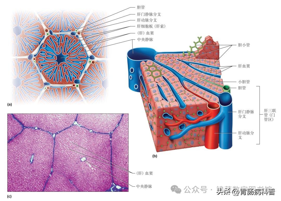 ▲ 肝小叶。 (a) 肝小叶的横断面。 (b) 肝小叶的纵向放大切面。 (c) 肝小叶横断面的光学显微照片(17 倍)。