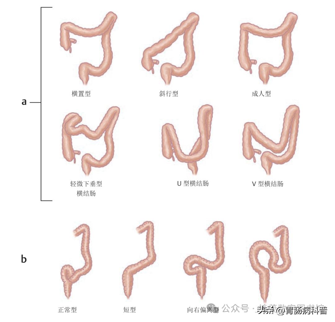 △ (a) 回肠开口和乙状结肠之间的结肠各部分的分型。(b) 乙状结肠的分型。正常乙状结肠类型是胎儿期最常见的类型。