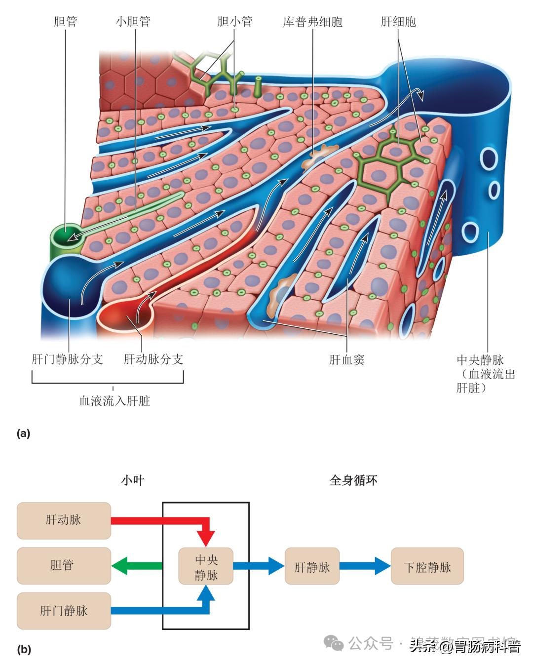 ▲ 肝脏的各个叶,(a)从前方观察,(b)从下方观察。
