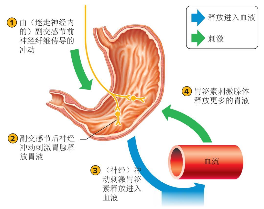 ▲ 胃液的分泌部分受副交感神经冲动的调节,这些冲动能够刺激胃液和胃泌素的释放。