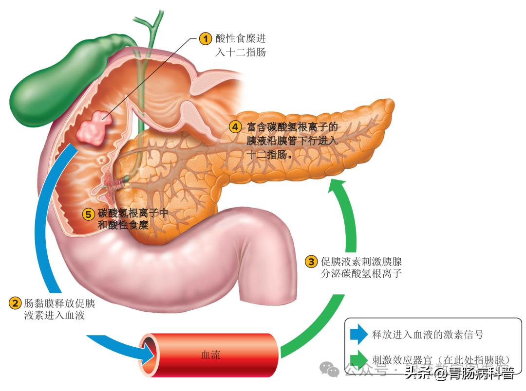 ▲ 来自胃的酸性食糜进入十二指肠后,会刺激促胰液素的释放,而促胰液素又进一步刺激胰液的分泌。