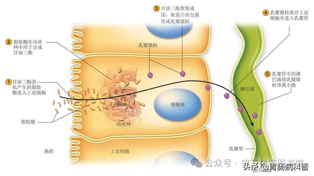 甘油三酯的吸收过程涉及多个步骤。(单层柱状上皮细胞上的微绒毛进一步增加了细胞膜的表面积,从而增强了吸收能力)