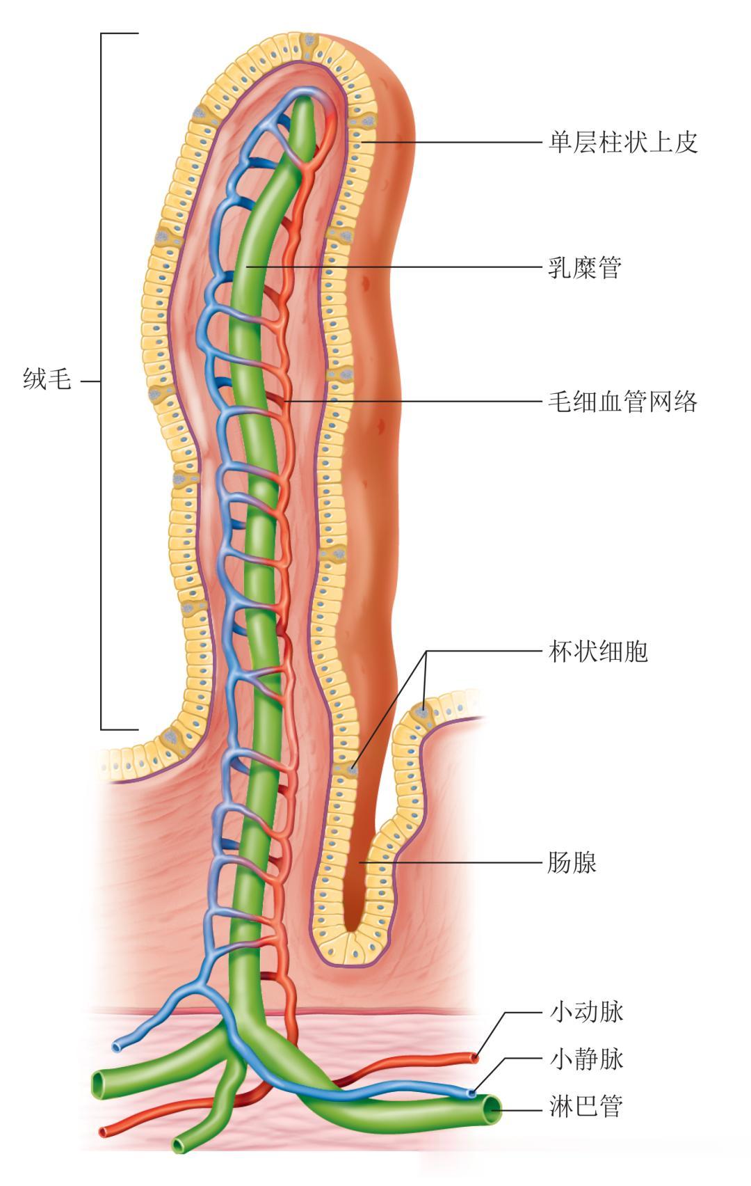 单个肠绒毛的结构。肠绒毛的延长形态显著增加了小肠的吸收表面积。
