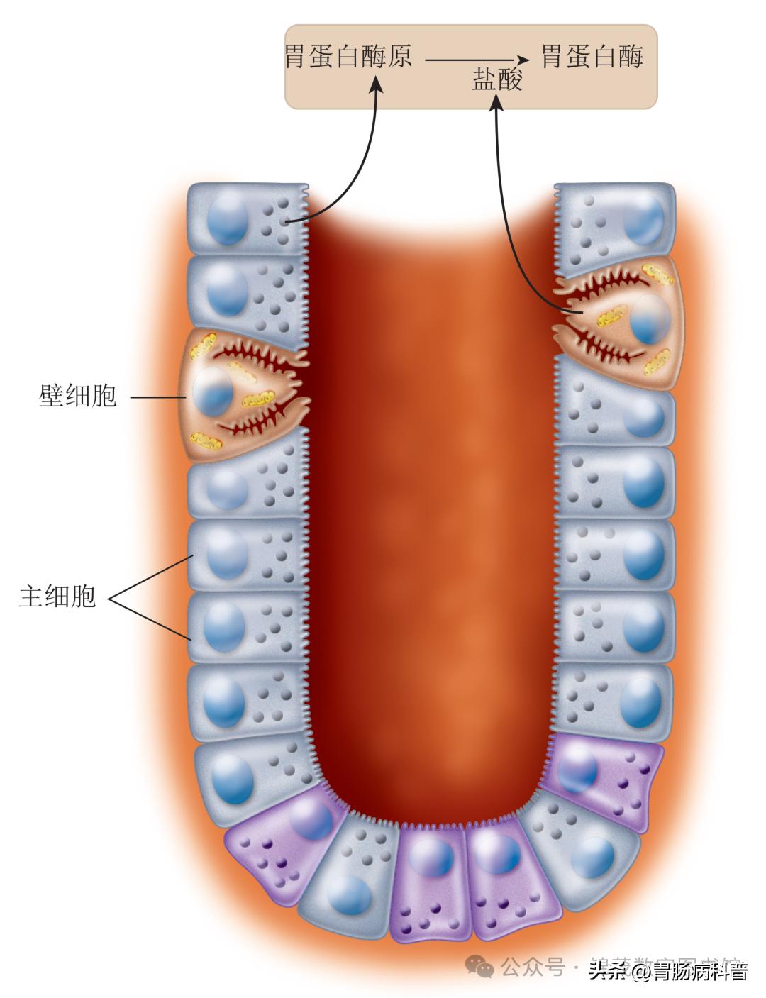 ▲ 胃黏膜。胃腺中的主细胞和壁细胞。