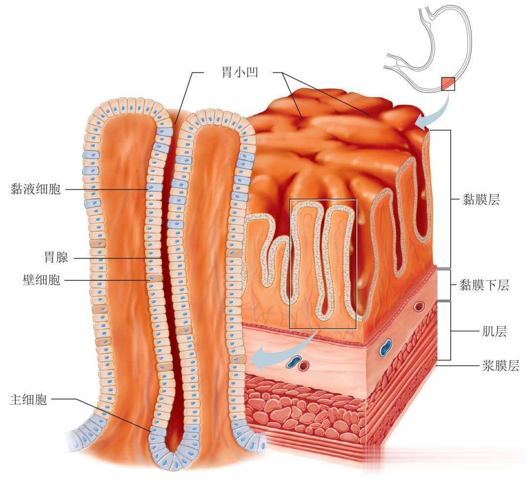▲ 胃黏膜。胃腺包括黏液细胞、壁细胞和主细胞。胃黏膜布满胃小凹,它们是胃腺的开口。