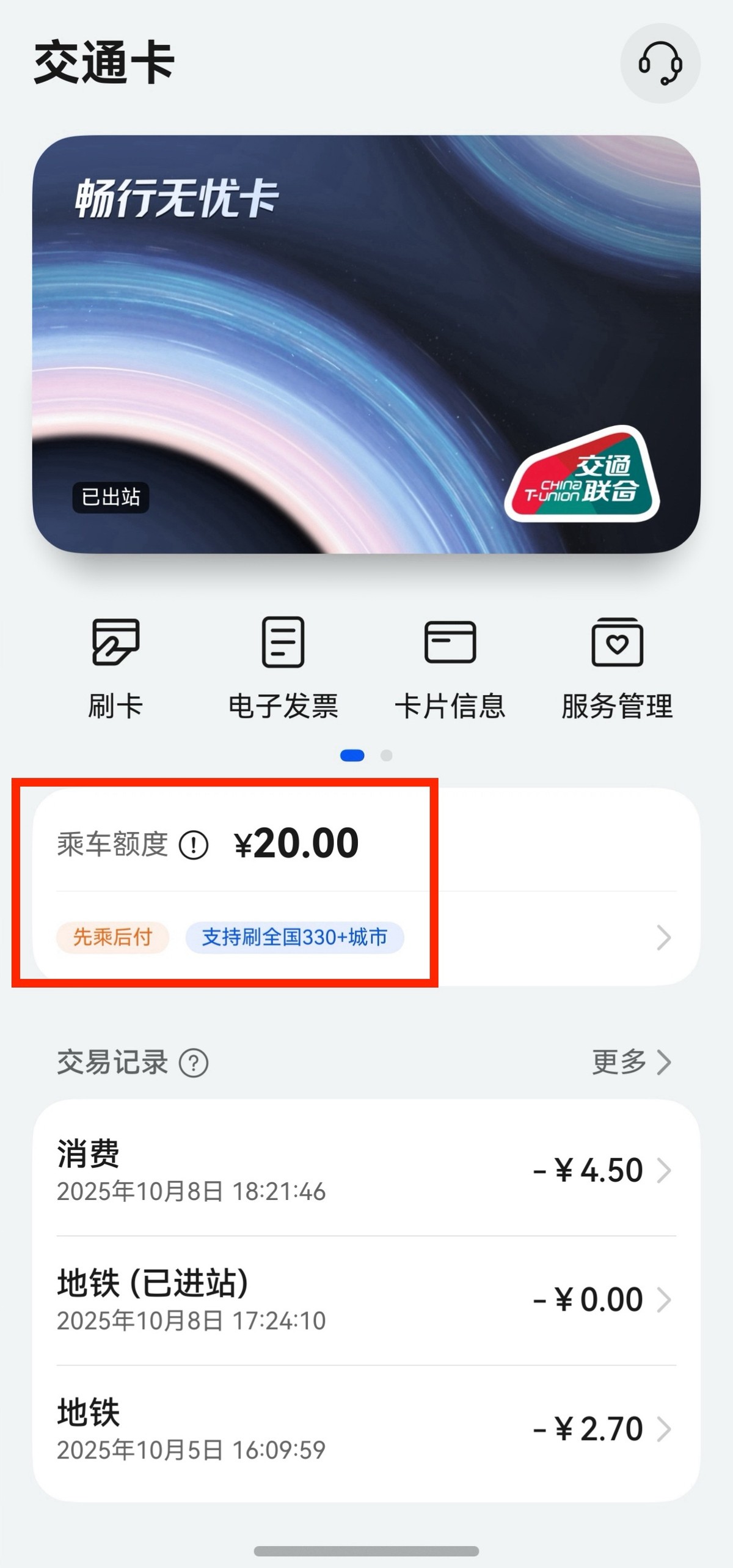 除了不用提前充值、覆盖城市广,畅行无忧卡在某些紧急情况下也特别靠谱。以前刷码乘车时,我们要是遇到没网或者手机没电,基本上就很难进站了,一整个焦头烂额。而它依托NFC技术,即使手机没电或者地铁站里没信号,照样可以正常刷卡进出站乘车。