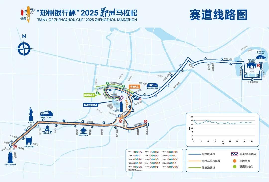 马拉松路线:郑州国际会展中心会展路(起点)→众意路(右转)→黄河东路(右转)→九如路(左转)→商务外环路(左转)→金水路→紫荆山立交桥(右转)→人民路→人民路与西大街交叉口附近(折返)→人民路→紫荆山立交桥(右转)→金水路→黄河南路与金水东路交叉口(折返)→金水路辅路(右转)→通泰路(右转)→商务外环路(右转)→九如路(右转)→龙湖外环东路(右转)→秋澄街(左转)→平安大道(右转)→博学路(左转)→龙子湖南路(左转)→明理路和修业街交叉口附近(折返)→明理路(右转)→龙子湖南路(右转)→博学路(左转)→平安大道(右转)→秋澄街(左转)→龙湖外环东路(左转)→九如路(右转)→黄河东路(左转)→众意路(左转)→郑州国际会展中心会展路(终点)