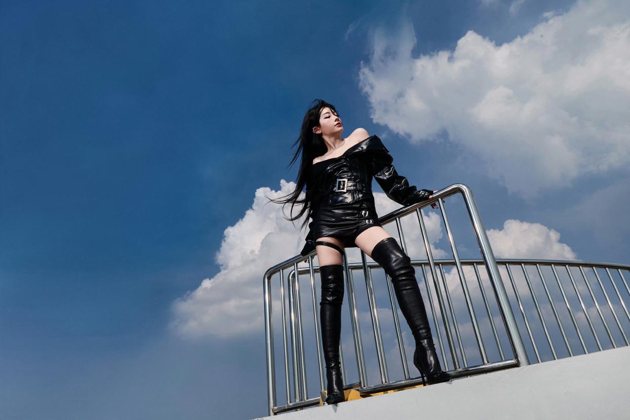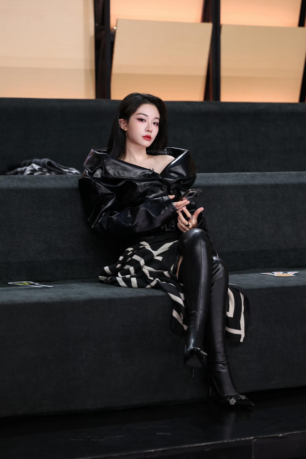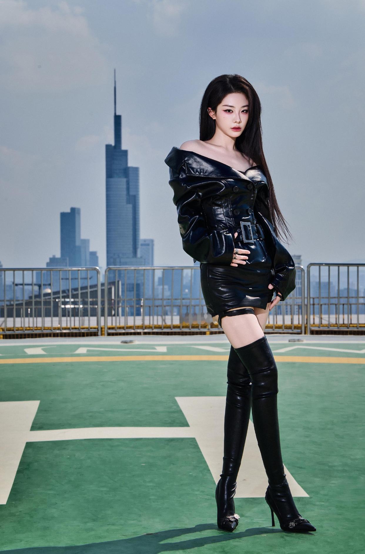 过膝皮靴的搭配是点睛之笔,与短裙的组合让她的腿部线条显得格外修长,腿环的小细节更是为整体造型增添了几分叛逆与个性。无论是在天台的随性摆拍,还是舞台上的光芒四射,这套穿搭都让她的优雅身姿展露无遗,时尚表现力满分。