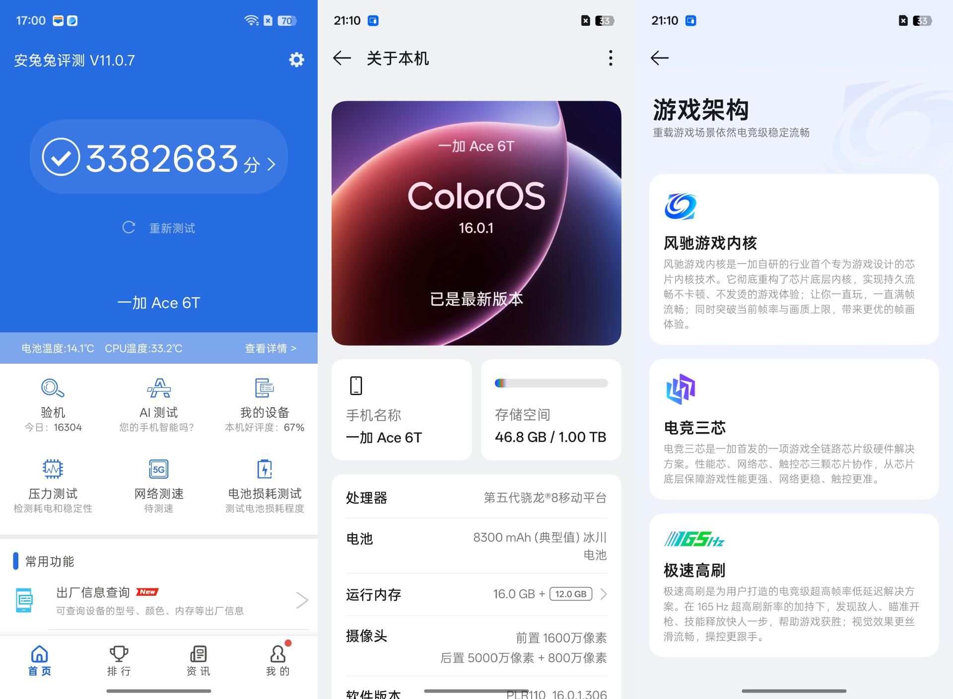 一加Ace 6T全球首发台积电3nm N3P工艺的第五代骁龙8处理器(骁龙8 Gen5),搭配LPDDR5X Ultra内存与UFS 4.1闪存,构建起当前次旗舰市场顶级的“性能铁三角”,安兔兔评测轻松超过338万的高分,稳居当前安卓阵营第一梯队,堪称“性能猛兽”。