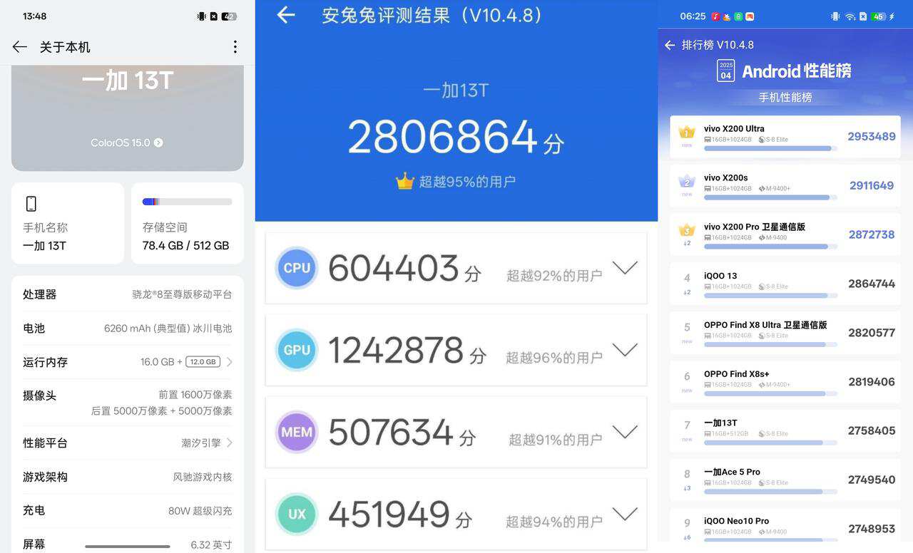 一加13T性能也十分强劲,采用了目前最强的安卓处理器骁龙8至尊版,配合LPDDR5X以及UFS4.0的存储,安卓中最强的性能搭配。用娱乐兔轻松跑到280多万分,在小屏旗舰中应该是当之无愧的第一了。