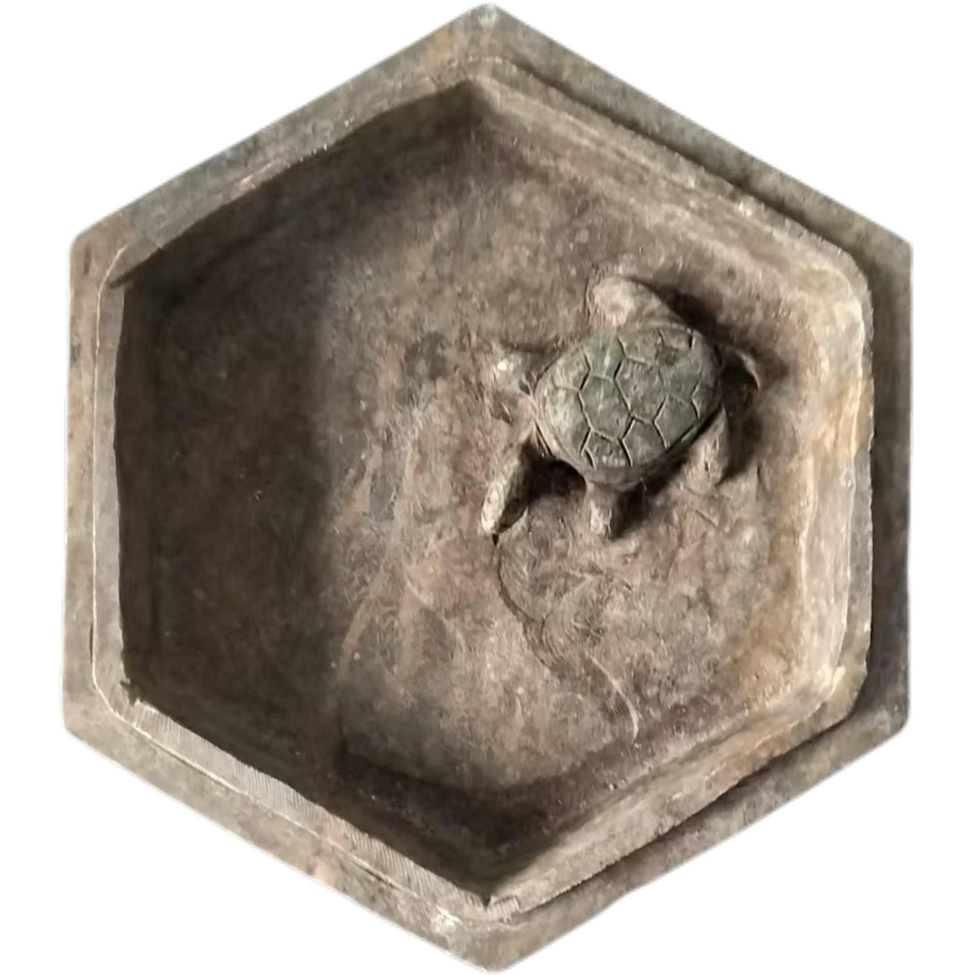 砚面雕刻的龟纹,生动逼真。龟在中国传统文化里是长寿与智慧的化身,古人认为龟能知吉凶、辨祸福,且寿命悠长。砚面上的龟,龟甲纹理清晰,龟首微抬,神态悠然,仿佛在砚台这片小天地里静守岁月。这一雕刻不仅为砚台增添了祥瑞之气,更体现了文人对长寿与智慧的向往,希望在研墨书写间,能沾染龟的灵性,让才思如泉涌,生命似龟长。