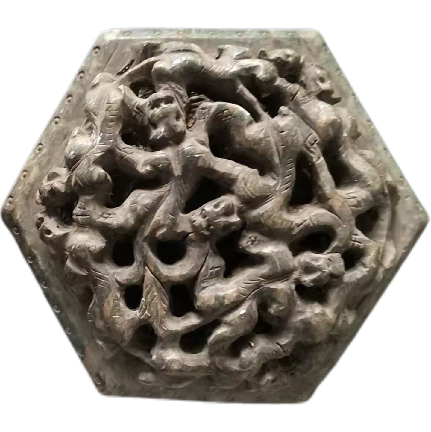 (二)砚盖透雕:群兽嬉戏的生机图景砚盖的透雕工艺极为精湛,雕刻出群兽嬉戏的场景。透雕让图案有了强烈的立体感与空间感,群兽的形象呼之欲出。它们或奔跑、或玩耍、或相互依偎,姿态各异,充满了生机与活力。透雕的孔洞分布巧妙,光线可透过孔洞洒入,使整个画面更加灵动,仿佛这些兽类并非静止于石上,而是随时会跃出砚盖,在书斋中嬉戏。这展现了清末工匠高超的技艺,每一刀、每一凿都凝聚着匠人的心血与对生活的热爱。