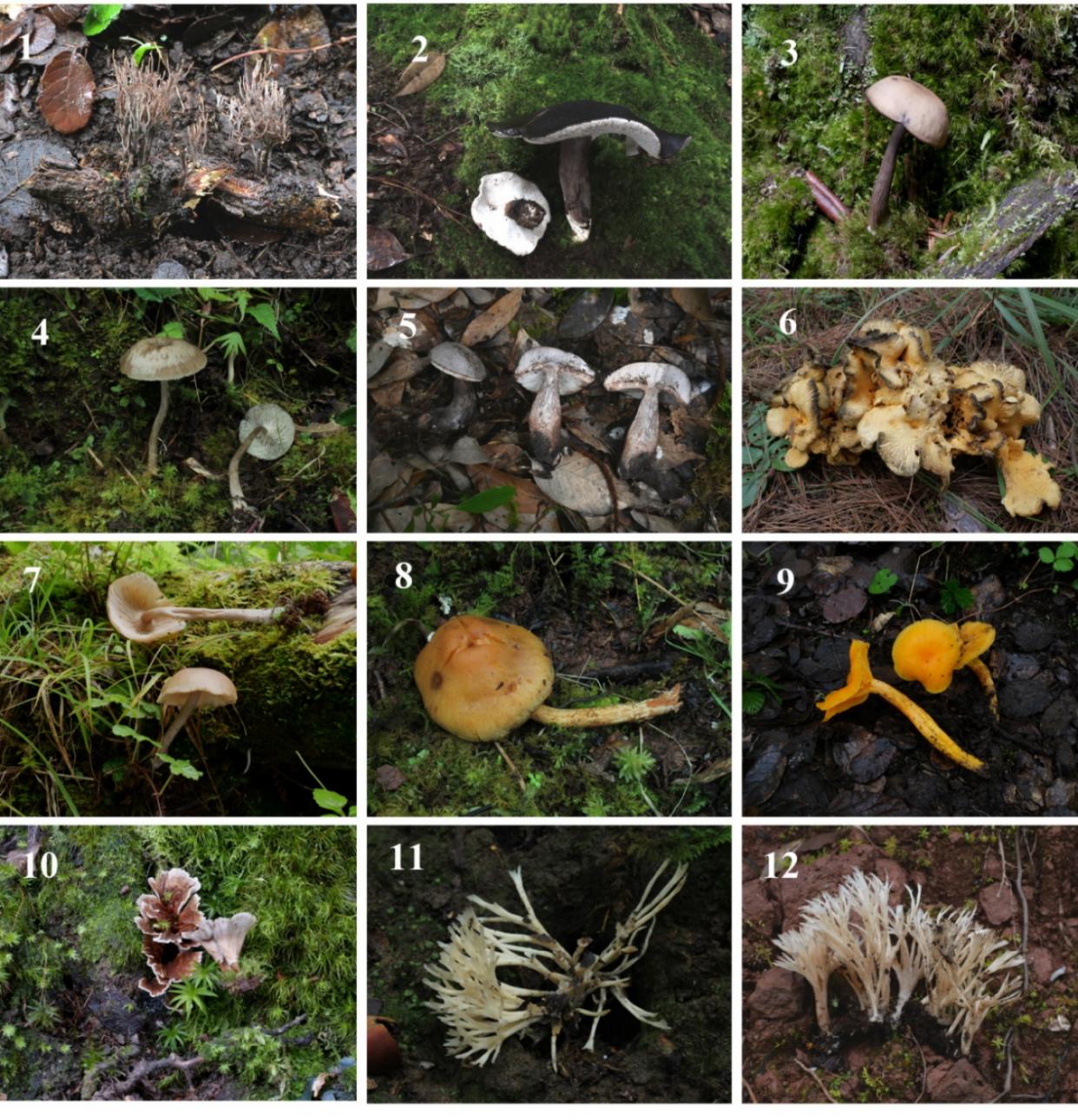 本次调查发现的新物种:1.杯密瑚菌Artomyces pteruloides、2.长柄拟牛肝菌Boletopsis longipes、3.大孢色孢菌Callistosporium macrosporum、4.拟脐杯离褶伞Clitolyophyllum paraumbilicatum、5.华黑盖新红孢牛肝菌Neoporphyrellus sinoalboater、6.宽盖多足菌Polypus latipileatus、7.宽孢假杯伞Pseudoclitocybe latispora、8.小脐赤雀菌Pyrrhulomyces umbilicatellus、9.云南华湿伞Sinohygrocybe yunnanensis、10.暗色拟韧革菌Stereopsis fusca、11.中国拟胶瑚菌属Tremellodendropsis sinensis、12.高山拟胶瑚菌Tremellodendropsis alpina