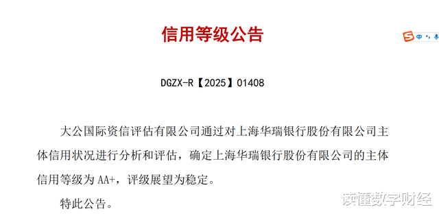 11月03日,中国外汇交易中心发布上海华瑞银行股份有限公司(下称:华瑞银行)2025年企业信用评级报告:大公国际资信评估有限公司确定华瑞银行的主体信用等级为AA+,评级展望为稳定。此前其信用评级为AA。
