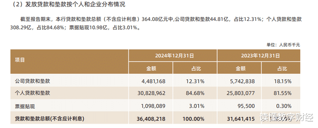 从财务数据来看华瑞银行的个人贷款业务在信贷业务中的占比正在逐步增长,截至2024年末,该行贷款和垫款总额为364.08亿元。其中,个人贷款余额为308.29亿元,较2023年末增加19.48%,占贷款和垫款总额的84.68%。