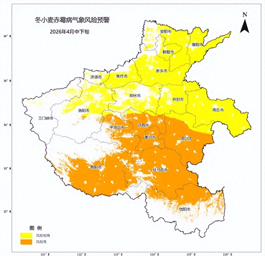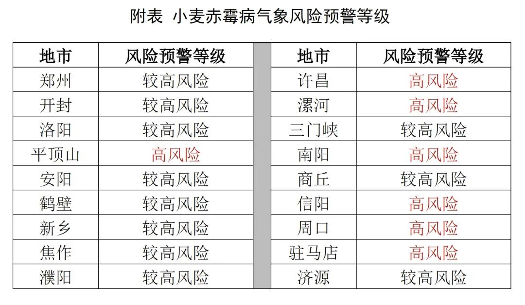 河南省农业农村厅、河南省气象局4月13日联合发布小麦赤霉病气象风险预警:目前我省大部小麦处于拔节孕穗期,豫南、豫中部分地区进入抽穗期,豫南个别地块已开花。预计4月中下旬我省将出现多轮降水过程,与小麦抽穗扬花期重叠度高,全省大部特别是黄河以南地区存在小麦赤霉病发生流行气象风险,信阳、南阳、驻马店、周口、平顶山、漯河、许昌7市赤霉病发生流行气象风险高,需重点加强防范。