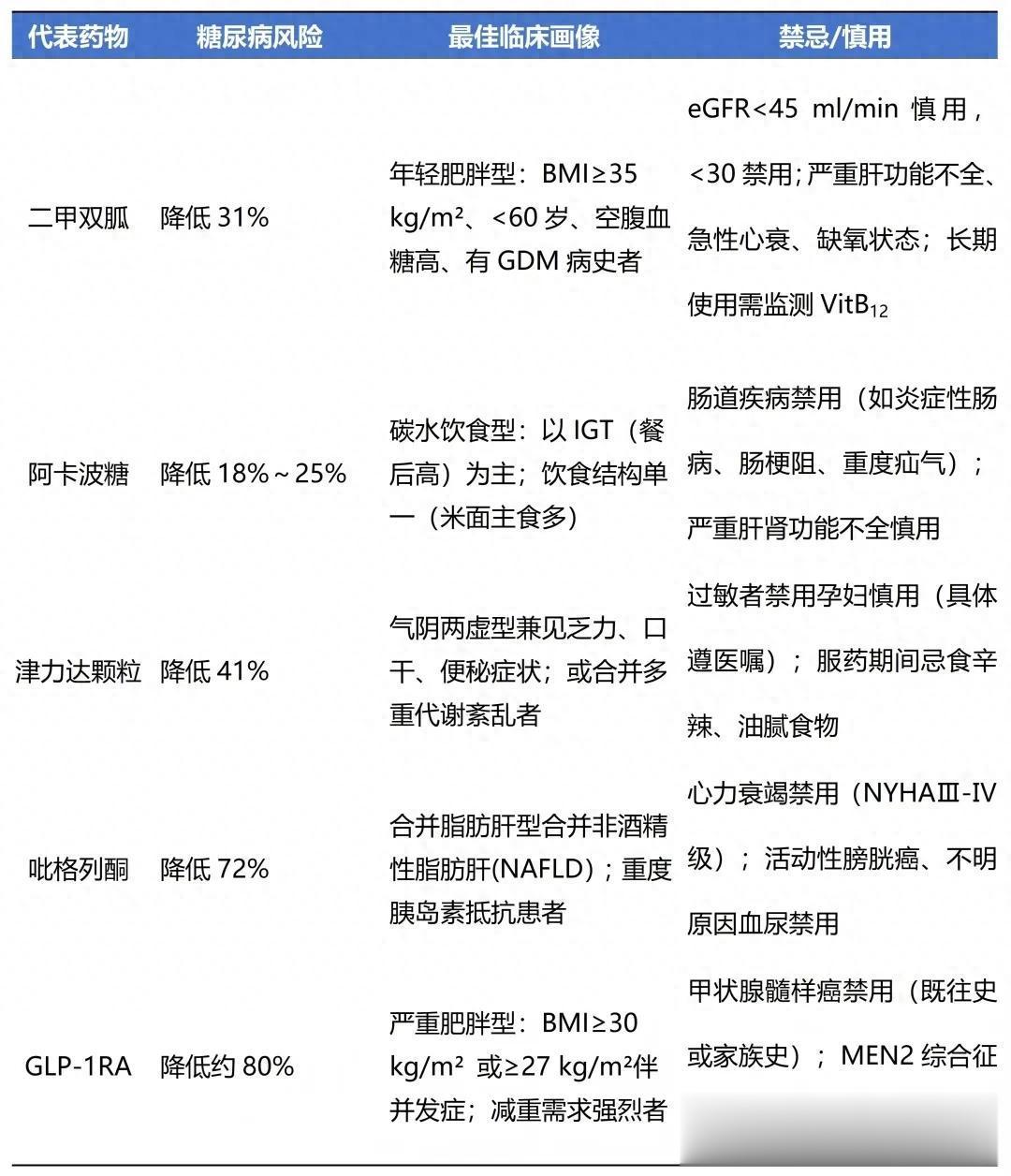 注意:对老年人(>60岁)及单纯餐后血糖升高者,其预防效果不及生活方式干预。