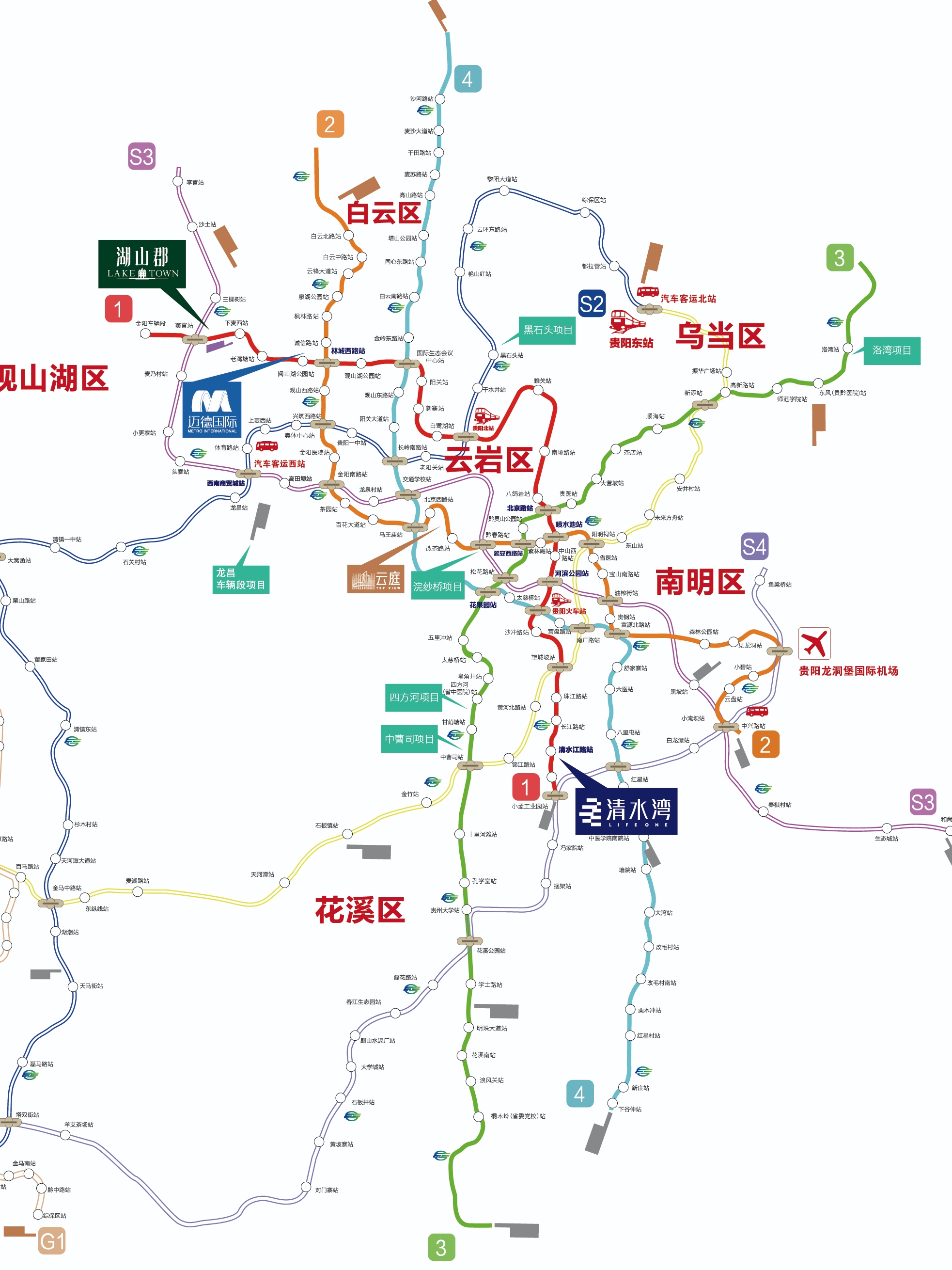 S2线是从贵安新区,经过清镇、金华等板块,接入观山湖西,再过贵阳一中、长岭南路,经过贵阳北站,再沿着白云区黑石头板块北上进入高新区,然后再连通贵阳东站,远期还会和S1线延伸到贵阳东站的线路,形成闭环,就成了名副其实贵阳贵安核心环线。