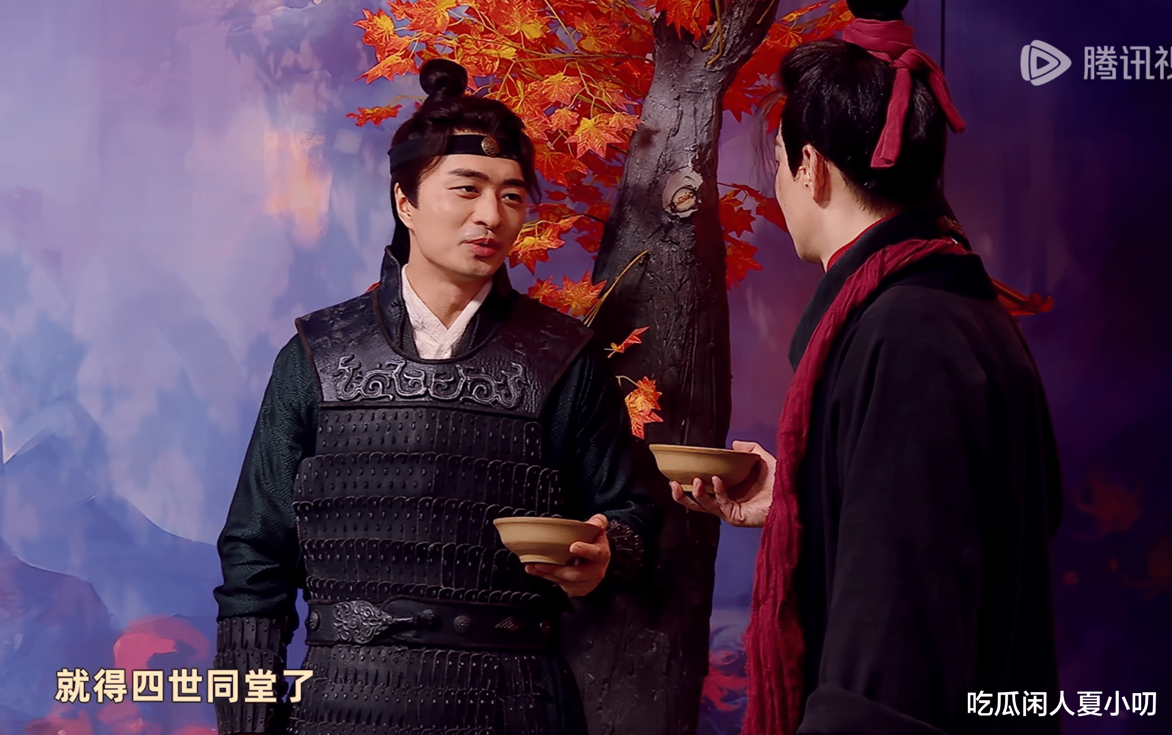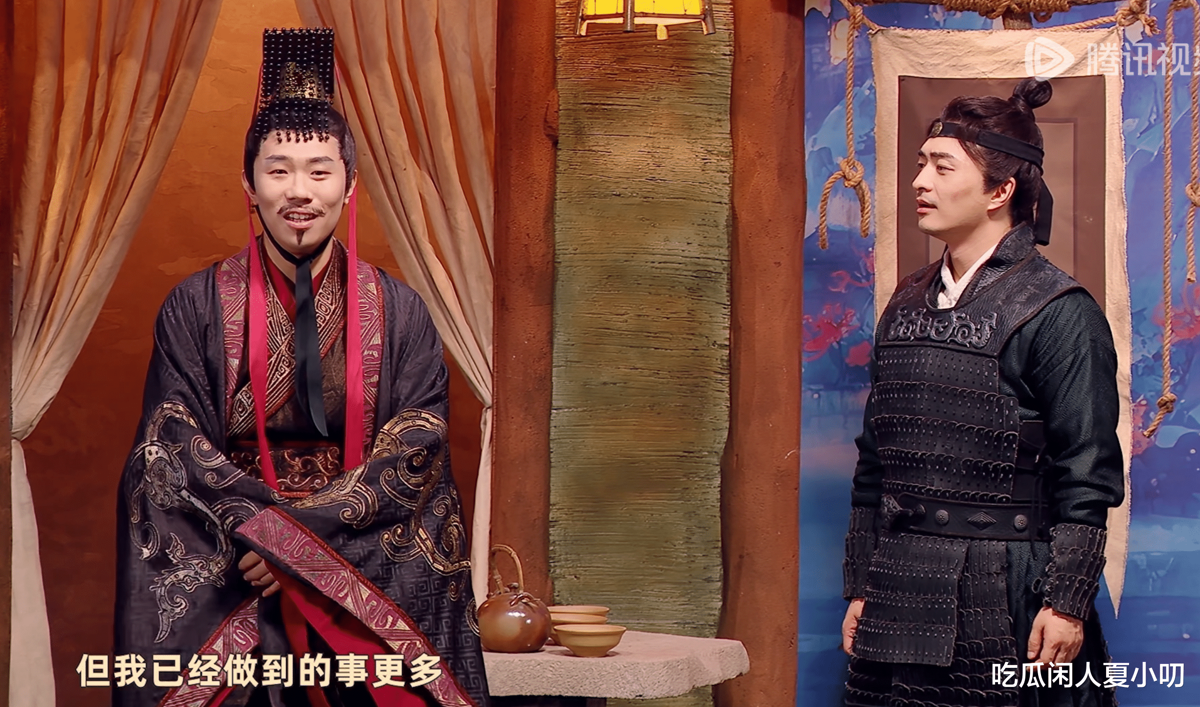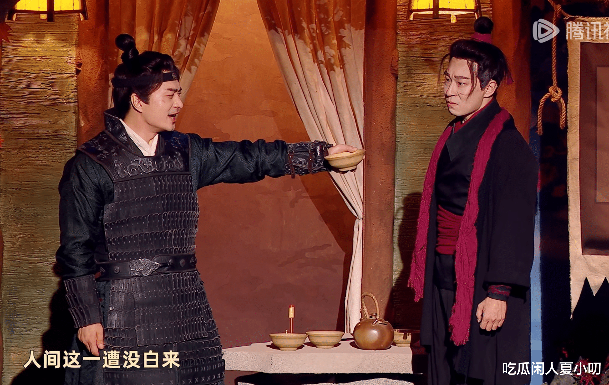 这里,原本应该是松天硕先说“不会碰上秦王吧”,但因为太入戏忘词了,刘旸又觉得这是小队的最后一个作品,必须要提一下“四士同堂”,所以,他说了松天硕的词。