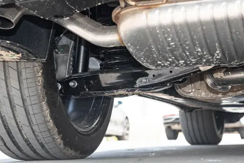 侧面线条很有力量感,腰线从车头一直延伸到车尾,微微向上倾斜,显得车子很精神。21 英寸的银黑双色轮毂很大气,和车身搭配起来比例很协调。轮眉和侧裙都是熏黑处理,增加了点运动感,我家小孩说这个设计像 “机器人的铠甲”。