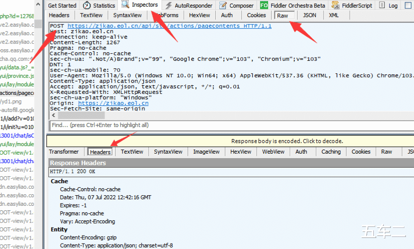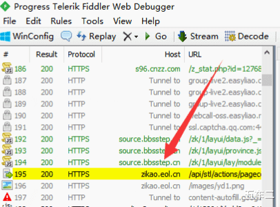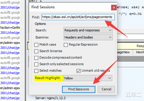 Fiddler会以黄色将搜索到的结果显示出来,我们点击一下他。