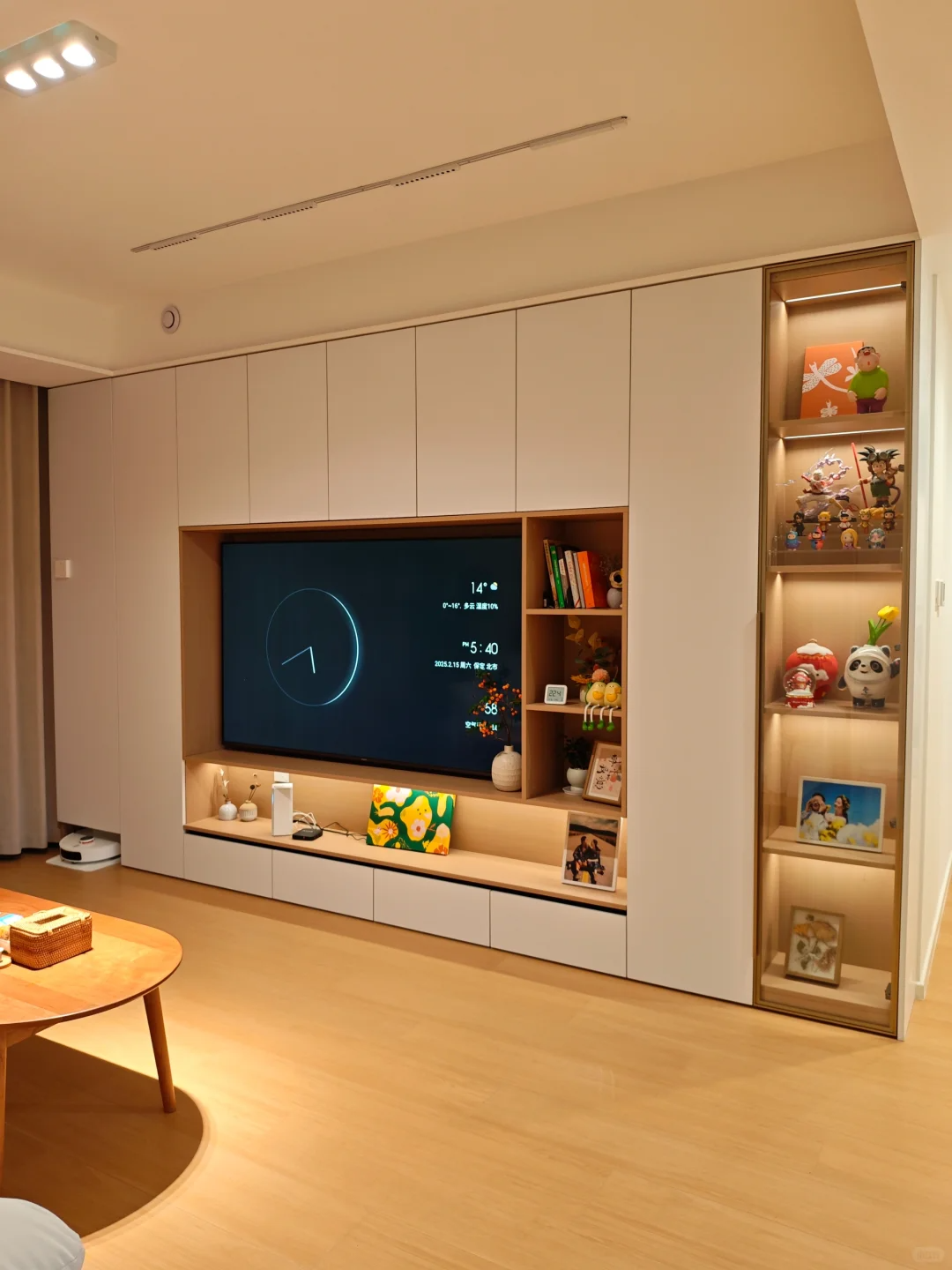 网友@沉入 的分享:我还是有点强迫症的,家里做的满墙电视柜就是我自己设计的,尺寸都是我根据一些物品的尺寸选择的,做出来的效果真的让我非常舒服。