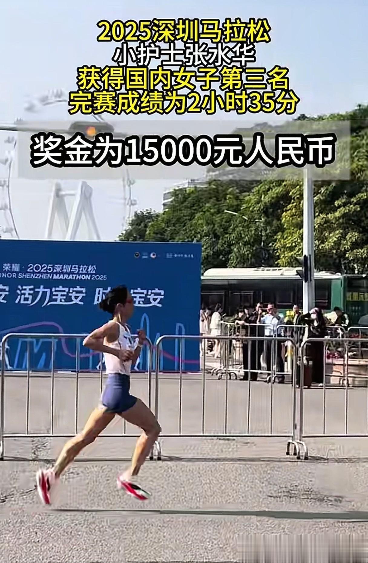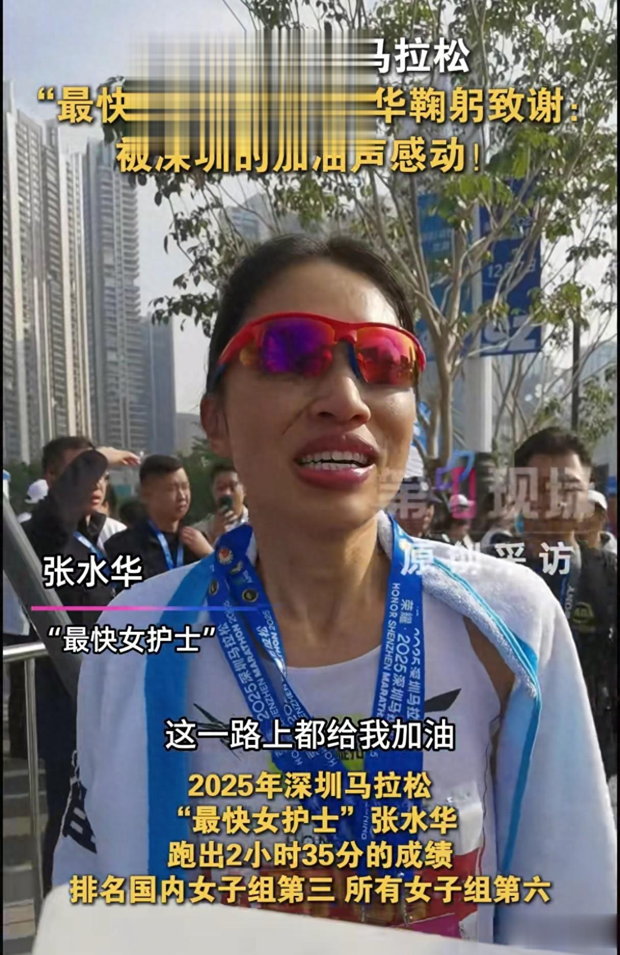 我们在深圳马拉松赛场上,又看到了那个熟悉的身影,“最快女护士”张水华又取得好成绩,夺得国内女子组第三名,所有女子组第六名,获得了1.5万元的奖金。