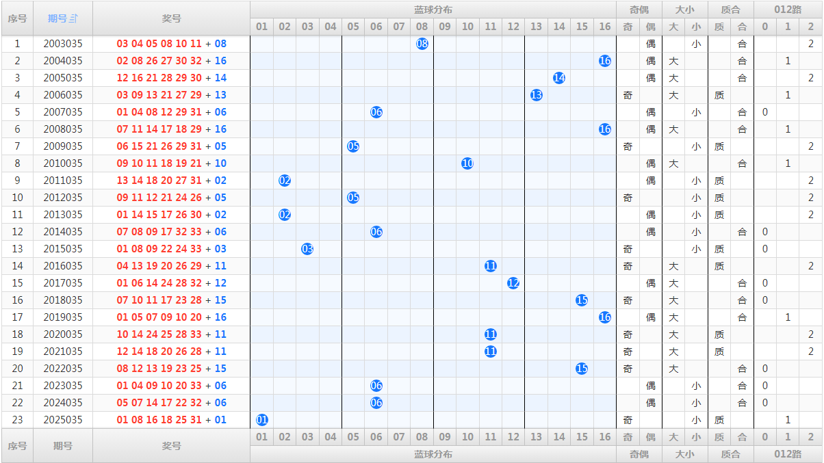 八、历史同期,蓝球开奖号码和走势图:
