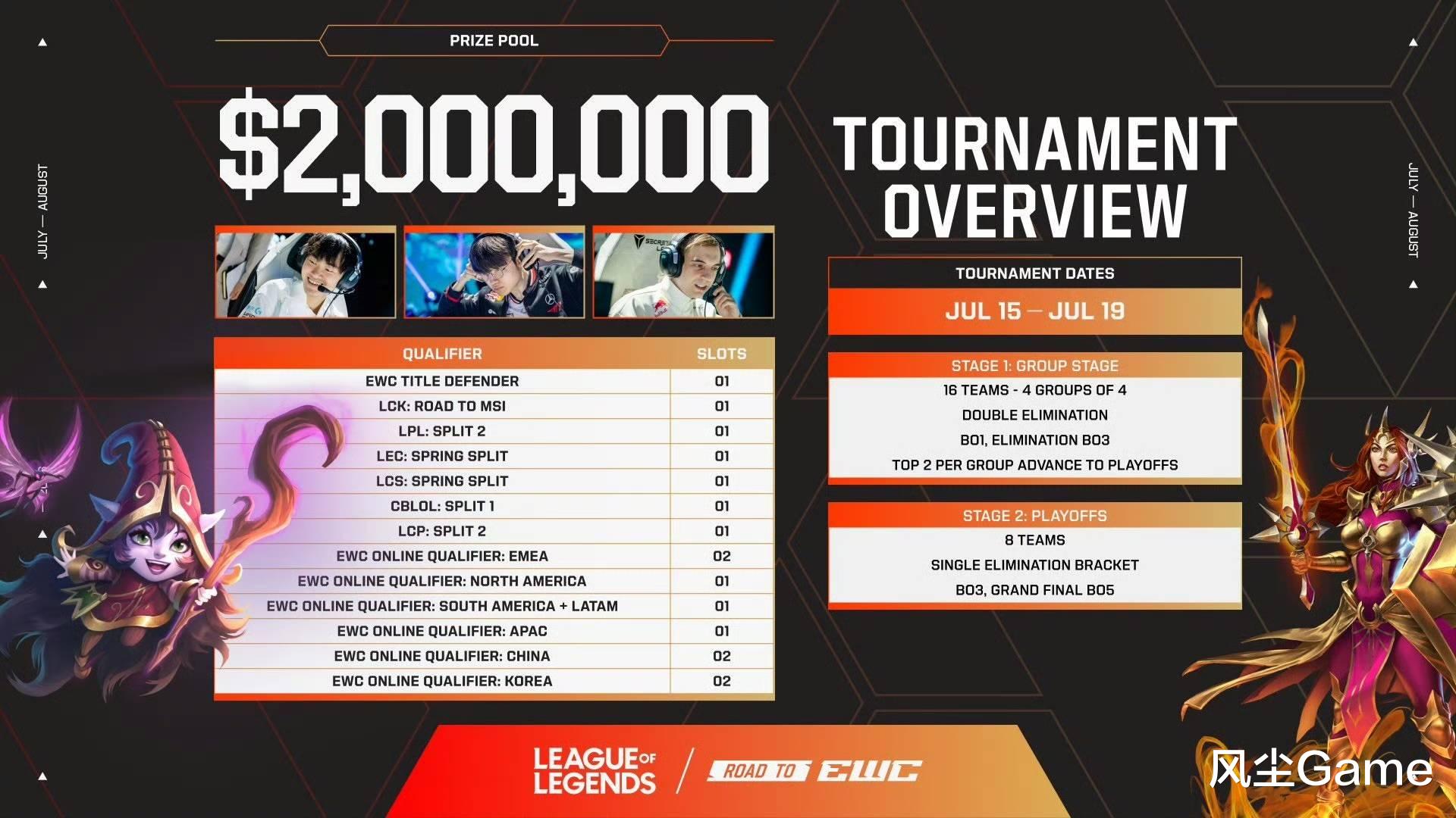 除了直邀队伍之外,LPL和LCK赛区,还有2个参赛名额,LCK的话是3个,LCP、CBLOL、LCS各一个,正赛开打之前,要先打预选赛,LPL、LEC、LCK各两队,剩下三个赛区各一队,预选赛总计9支队伍参赛,赛制方面,小组赛16队分4组打双败,前2名晋级,淘汰赛BO3,决赛BO5。
