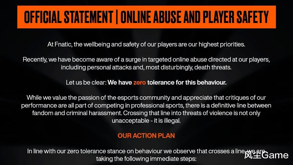 FNC部分极端粉丝,在论坛里疯狂攻击选手和教练,甚至还有人发布死亡威胁言论,FNC俱乐部得知之后,发布声明:我们对网络暴力和死亡威胁0容忍,俱乐部已经取证,把相关证据提交执法机关,好家伙,欧洲观众是真的疯狂啊,看个比赛,都能搞出死亡威胁这套,这真有点吓人吧。