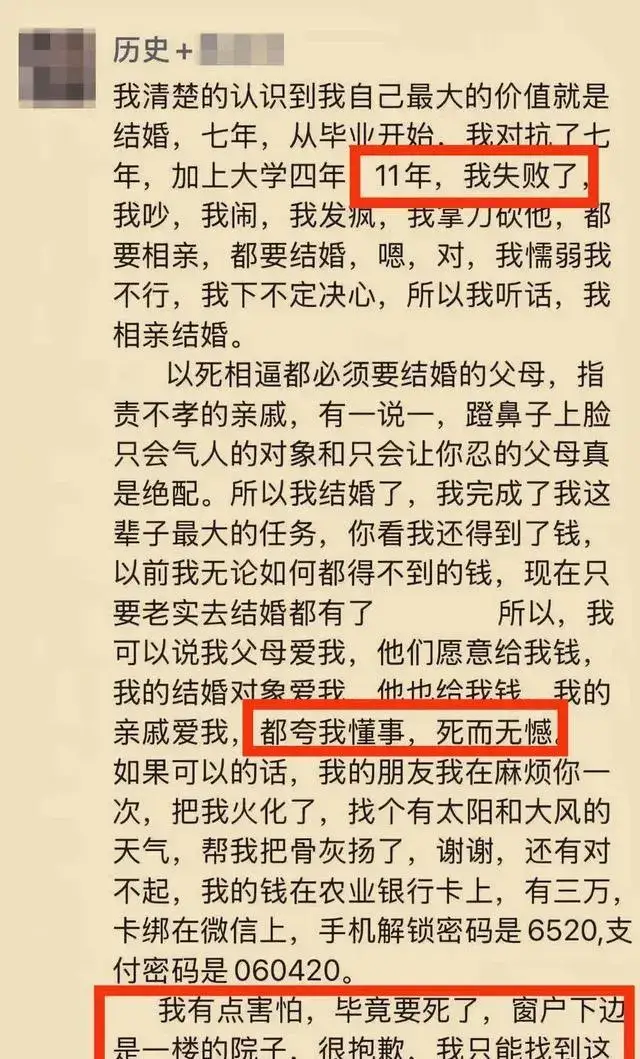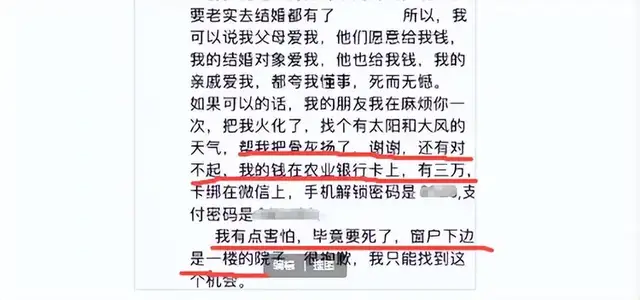 她留下的遗书没有激烈言辞,甚至清晰地写着银行卡密码和手机解锁密码,还在为可能惊扰一楼邻居而道歉。这种极致的冷静与温柔,与她决绝的选择形成刺眼对比,揭示了一个被原生家庭“爱”扼杀的悲剧。