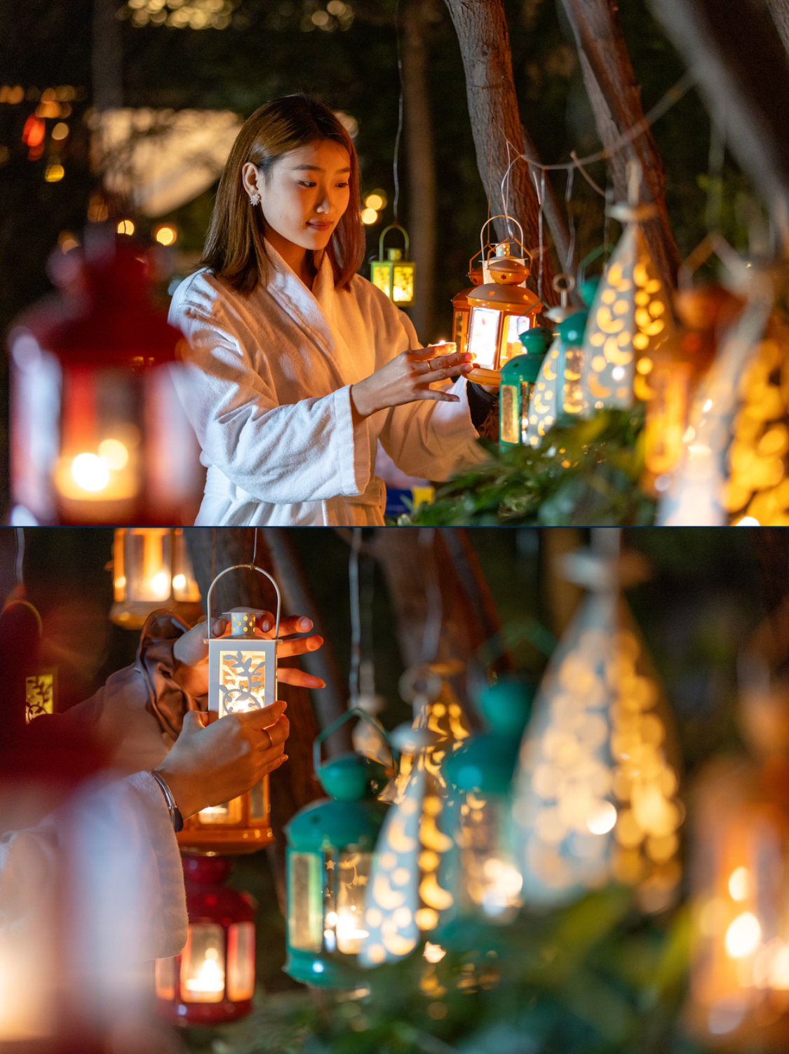 夜幕降临的悦椿,更是将浪漫氛围拉满。酒店增加了特色灯饰区,造型别致的灯、星灯点缀在草木与古建筑间,每日入夜的点灯仪式更是仪式感满满。随着灯光次第亮起,星星点点的光影让整座温泉区宛如梦幻秘境。暖汤氤氲,灯火摇曳,此时泡在温泉中,抬眼是朦胧夜色,耳畔是轻柔风声,随手一拍都是氛围感大片。